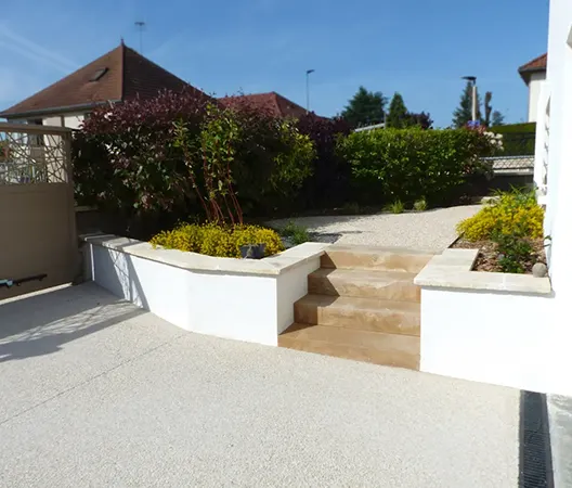 Il s'agit d'un revêtement de sol en béton armé ou fibré. Le béton reçoit par la suite un traitement coloré dont un panel varié est proposé.