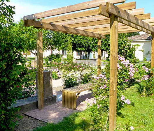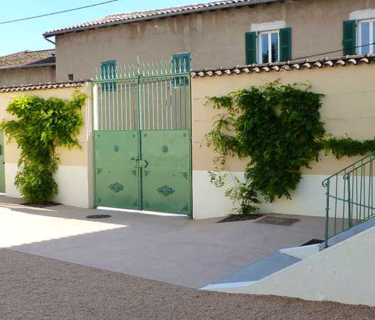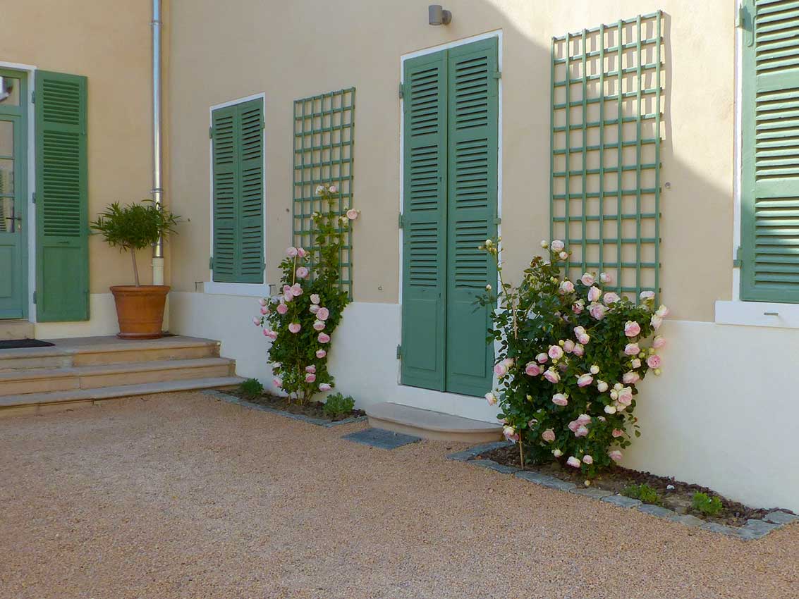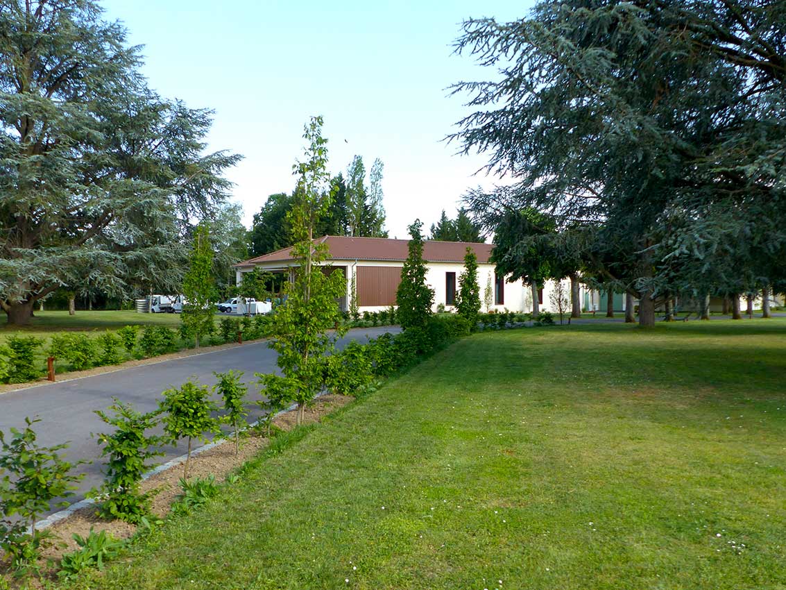 Dans ce parc arboré d’un château du Beaujolais, nos équipes ont entièrement réalisé une vaste roseraie, délimitée par des allées en sablé stabilisé. Les pergolas en bois structurent l’ensemble en apportant hauteur et perspective et des végétaux plus élancés ont été placés de façon à accompagner la façade du château, fraichement rénovée. L’arbre taillé en nuage rempli son rôle de point focal et semble comme porté par les massifs de différentes variétés de rosiers. D’autres massifs plus contemporains ont été réalisés pour apporter couleur et dynamisme à l’ensemble de la propriété.