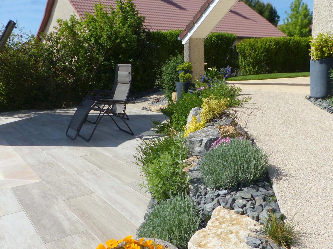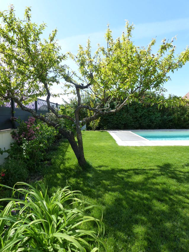 Optimisation d’un espace de passage afin de créer un véritable lieu de vie extérieur ! L’allée principale a été décalée de façon à accueillir une piscine aux dimensions idéales et une plage de piscine en dalles de grès cerame « bois » pour recevoir les bains de soleil. Le talus, traité comme une rocaille végétalisée, permet néanmoins un passage dérobé. La nouvelle allée en béton désactivé suit une pente douce qui a permis la suppression des quelques marches menant à l’entrée de la maison. Elle est soulignée de massifs fournis et colorés pour former un cocon de verdure ! Sur la partie arrière, installation d’un spa au niveau de la terrasse permet également d’ouvrir les perspectives sur le reste du jardin.