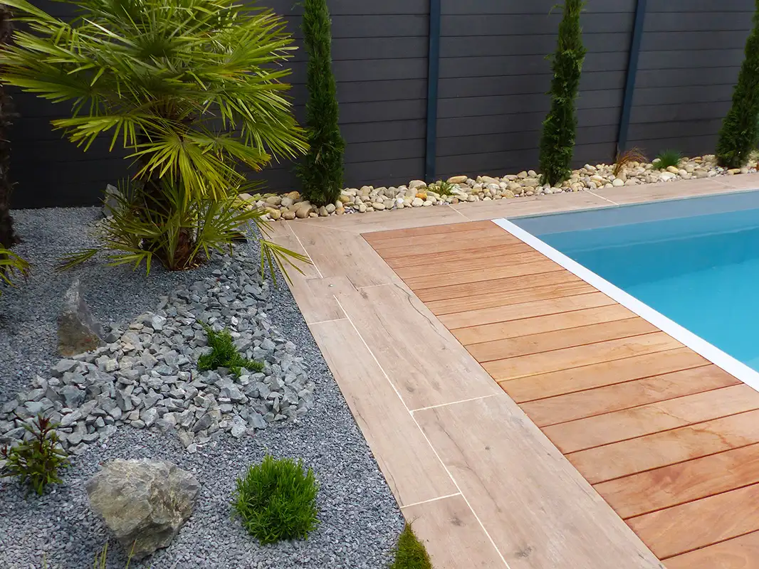 Changement radical pour ce jardin en région dijonnaise. Autour de la piscine, tous les aménagements ont été pensés pour agrémenter les moments de baignade de ces clients. Pas japonais et plage de piscine se répondent parfaitement, végétation méditerranéenne et rocailles apportent un vent de Sud à ce nouvel espace fonctionnel. Le gazon de placage assure un résultat immédiat et permet d’intégrer idéalement les pas qui se dirigent vers l’espace piscine.
