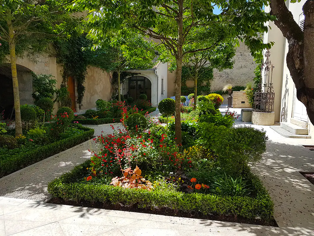Comme une continuité du jardin intérieur de l’autre côté des remparts, il s’inscrit dans l’histoire du lieu par l’emploi de matériaux nobles.