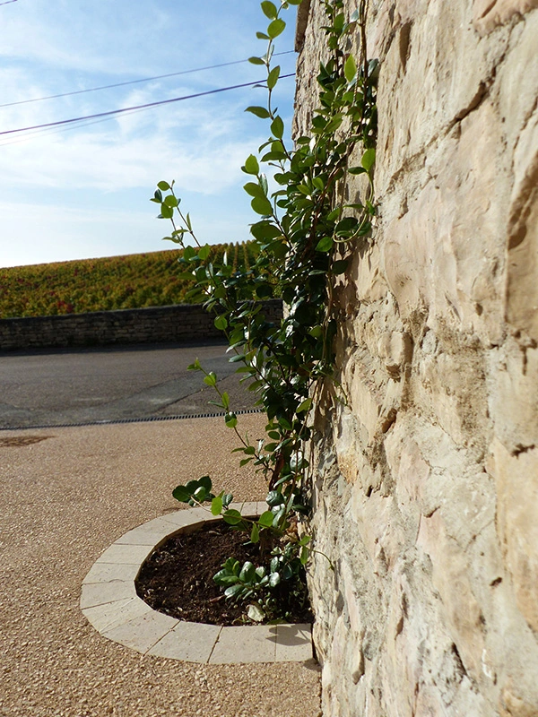 A l’arrière de la bâtisse de caractère, la terrasse privée intègre des murets en pierre de Région et un cheminement végétalisé guidant jusqu’à la vue imprenable des étendues de vignes. De là, on surplombe l’aménagement au rez-de-chaussée qui prend une tout autre ampleur avec ses dalles grand format. L’arche métallique complète l’aménagement et, une fois investie d’une plante grimpante, permettra de donner du relief à la façade.
