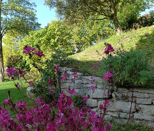 Créer un espace extérieur profondément lié à l’existant était primordial pour nos clients. A partir de pierre naturelle locale, nos équipes ont imaginé et réalisé un écrin composé de massifs colorés et généreux.