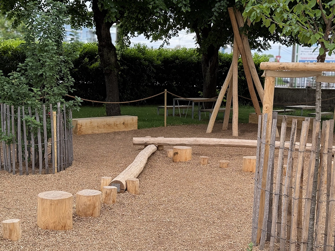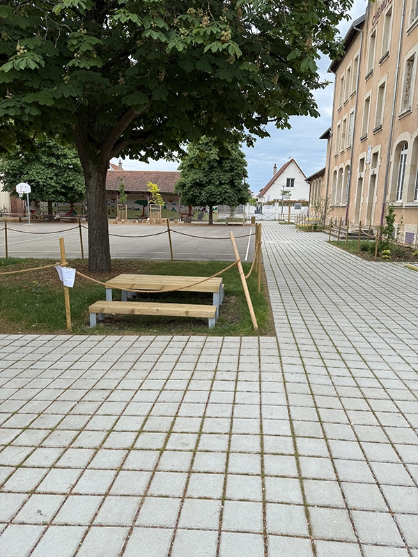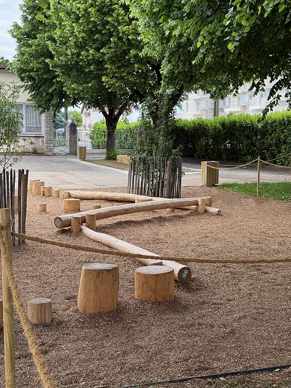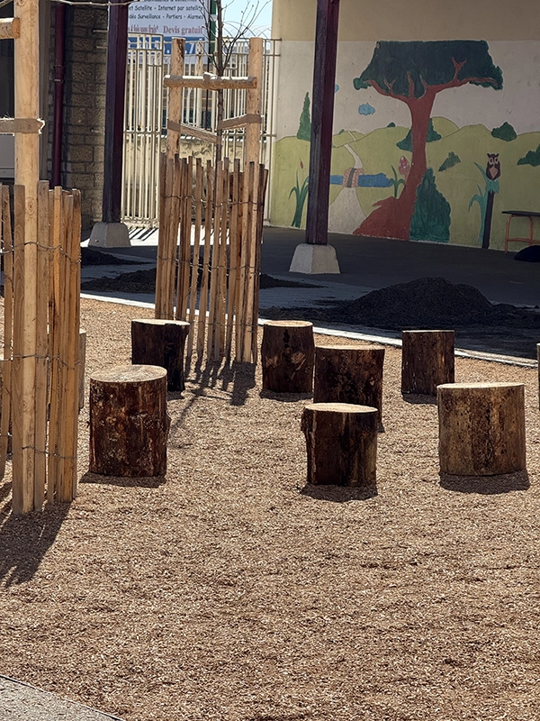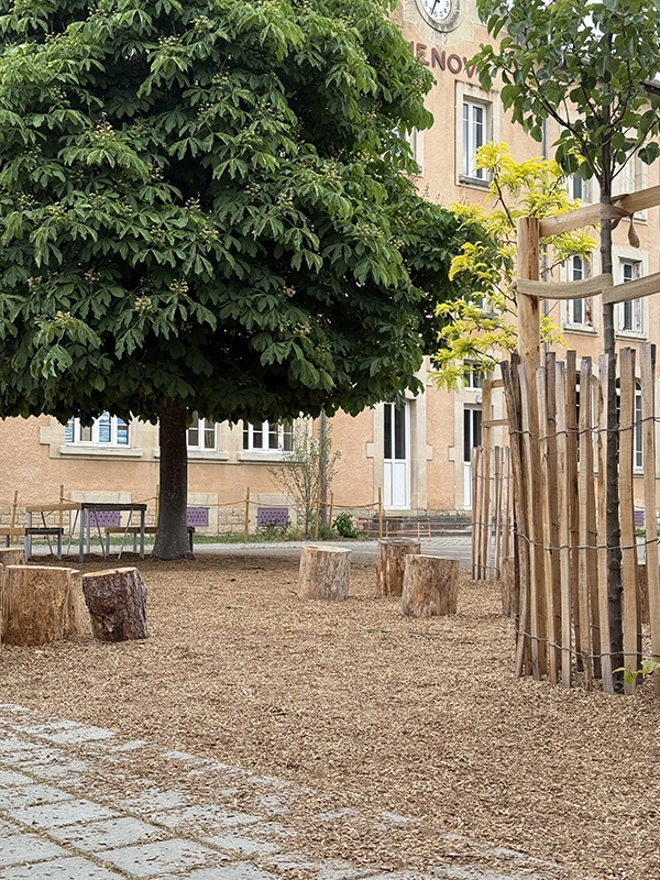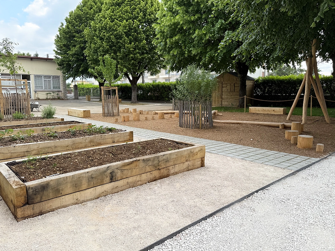 La réalisation d’aires de jeux permet de sociabiliser les enfants et d’apaiser le climat scolaire, tout comme la zone potagère qui permet de les sensibiliser au végétal. L’objectif était de repenser la cour d’école (dans une logique de désimperméabilisation) en un espace plus vert et plus agréable, au service du bien-être et des usages des enfants. L’une des priorités du chantier a été de garantir une livraison complète avant la fin des vacances scolaires, afin d’assurer la sécurité des élèves dès leur retour en classe.