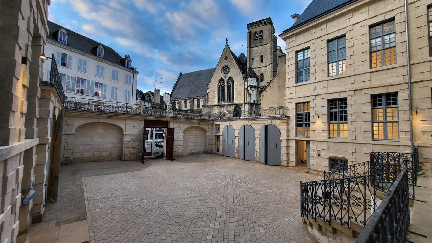 Notre intervention a consisté à la pose de pavés en pierre de Comblanchien, suivant un calepinage sur mesure, directement inspiré des motifs de marqueterie présents à l’intérieur du bâtiment. L’objectif étant d’assurer une continuité esthétique entre patrimoine bâti et aménagement extérieur.