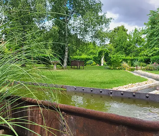 L’envie de nouveauté de nos clients et la configuration existante du terrain a permis à nos équipes de concevoir et de réaliser un cheminement d’eau traversant le jardin jusqu’à rejoindre un bassin rénové et agrandi. Une lame d’eau à donc été installée dans l’ancienne auge en métal de nos clients qui s’est vu offrir une nouvelle vie ! La retenue en acier tressé apporte un nouveau point de vue sur le bassin tout en jouant avec le denivelé du terrain.